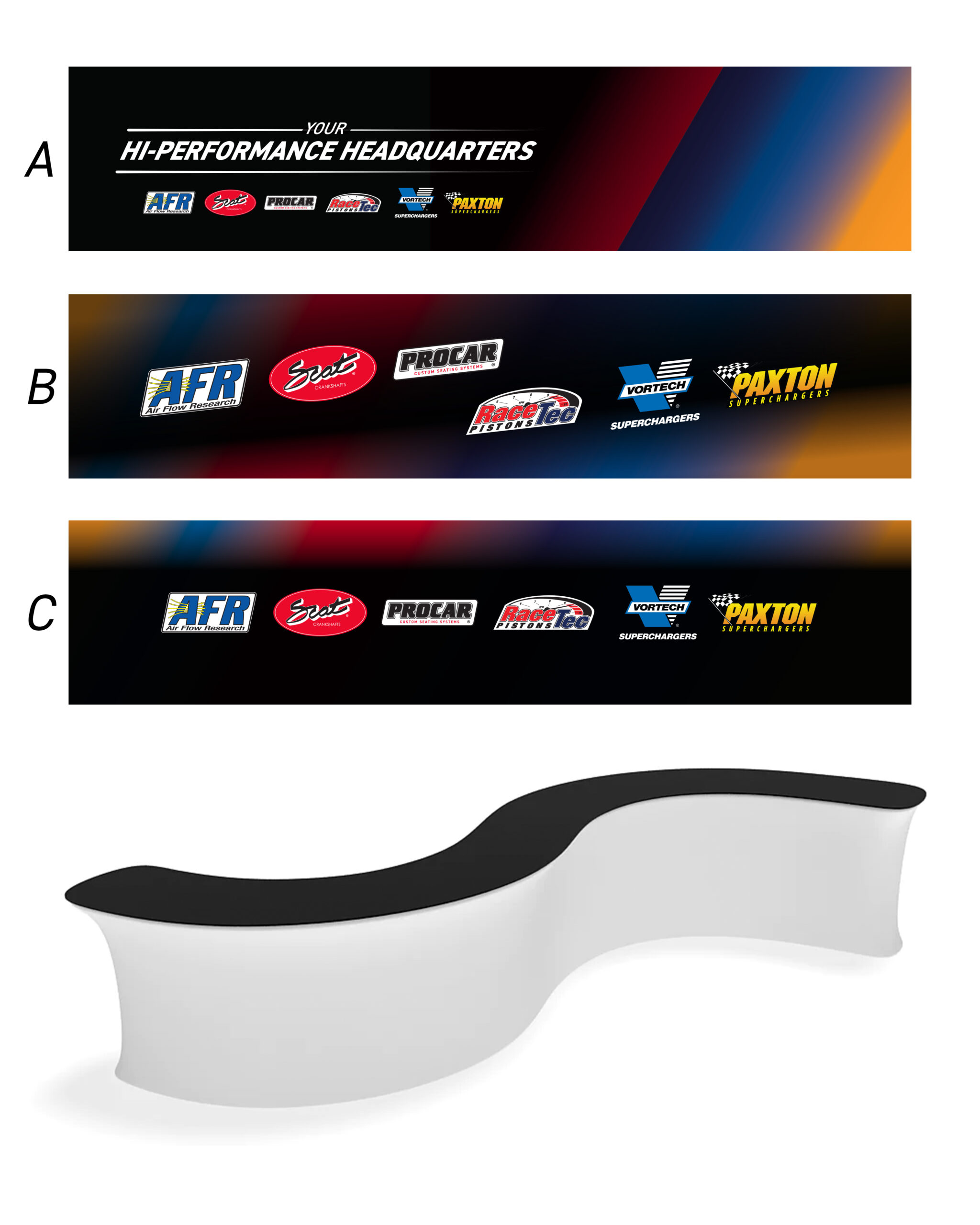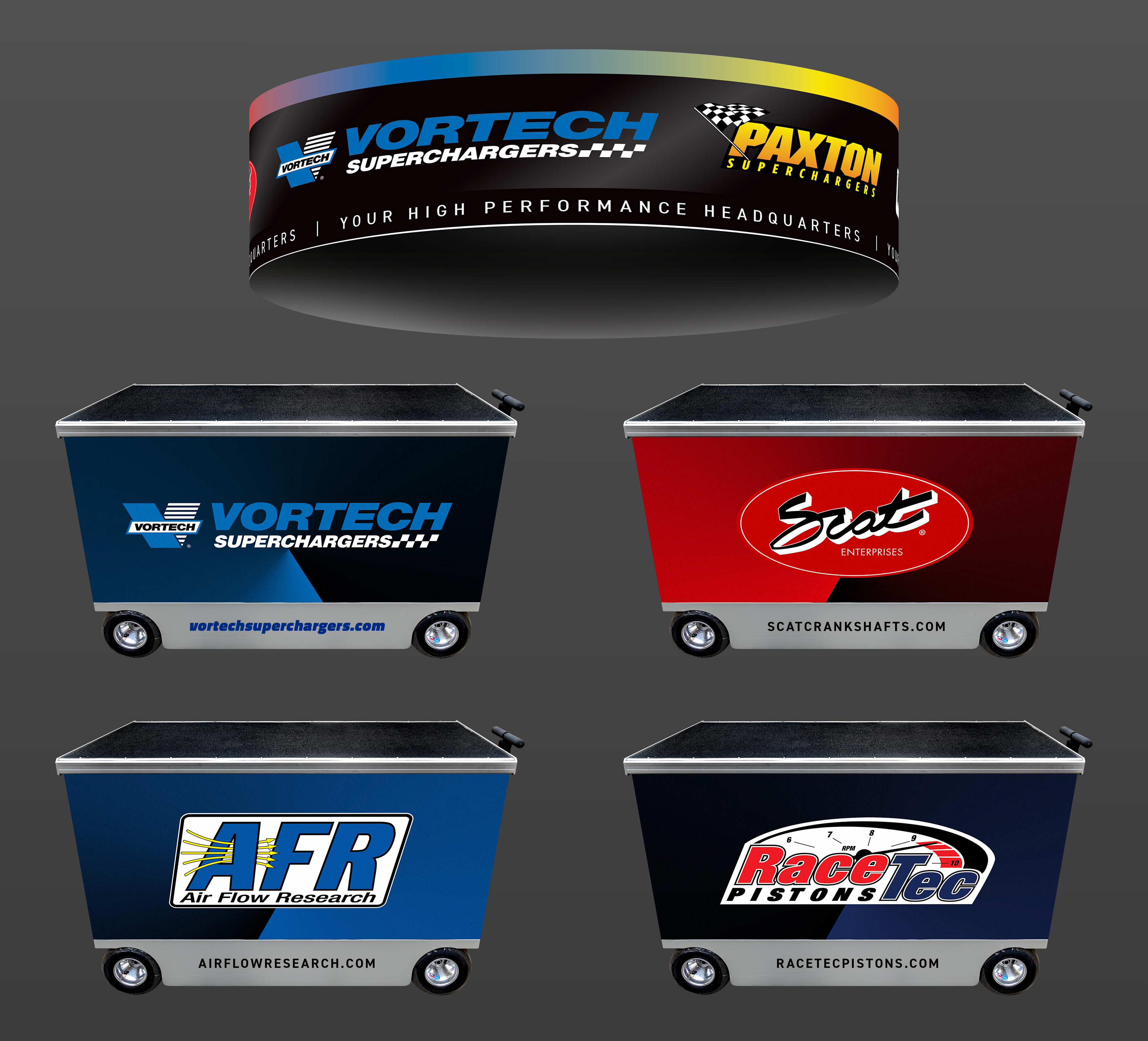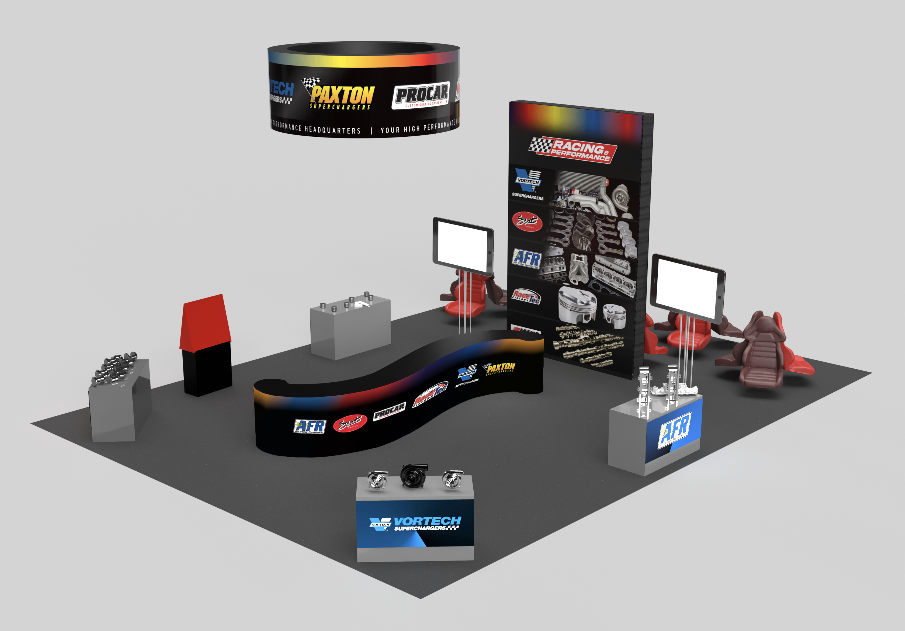 Brochure, labels, advertising, giveaway items, booth display, and booth layout